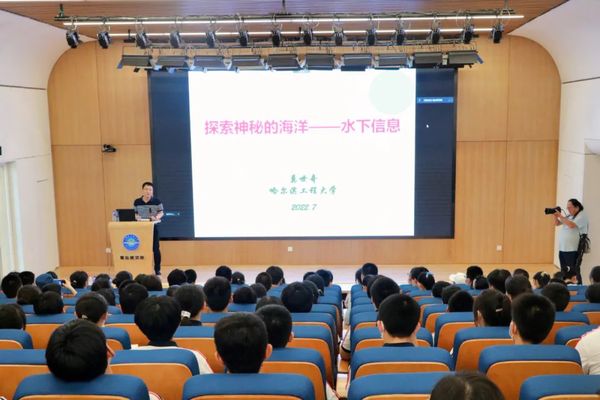 哈尔滨工程大学水声工程学院副院长莫世奇教授受邀为参观团队作“探索神秘的海洋—水下信息”专题讲座。他由浅入深地讲解了声波的特点、声纳的起源和发展、水中声波的应用以及水下信息科学发展之路四方面内容,为同学们揭开海洋神秘面纱,并鼓励同学们要带着问题去学习,带着觉知去实践,用知识的力量挖掘科学之谜,成为建设海洋强国、实现伟大中国梦的新生力量!